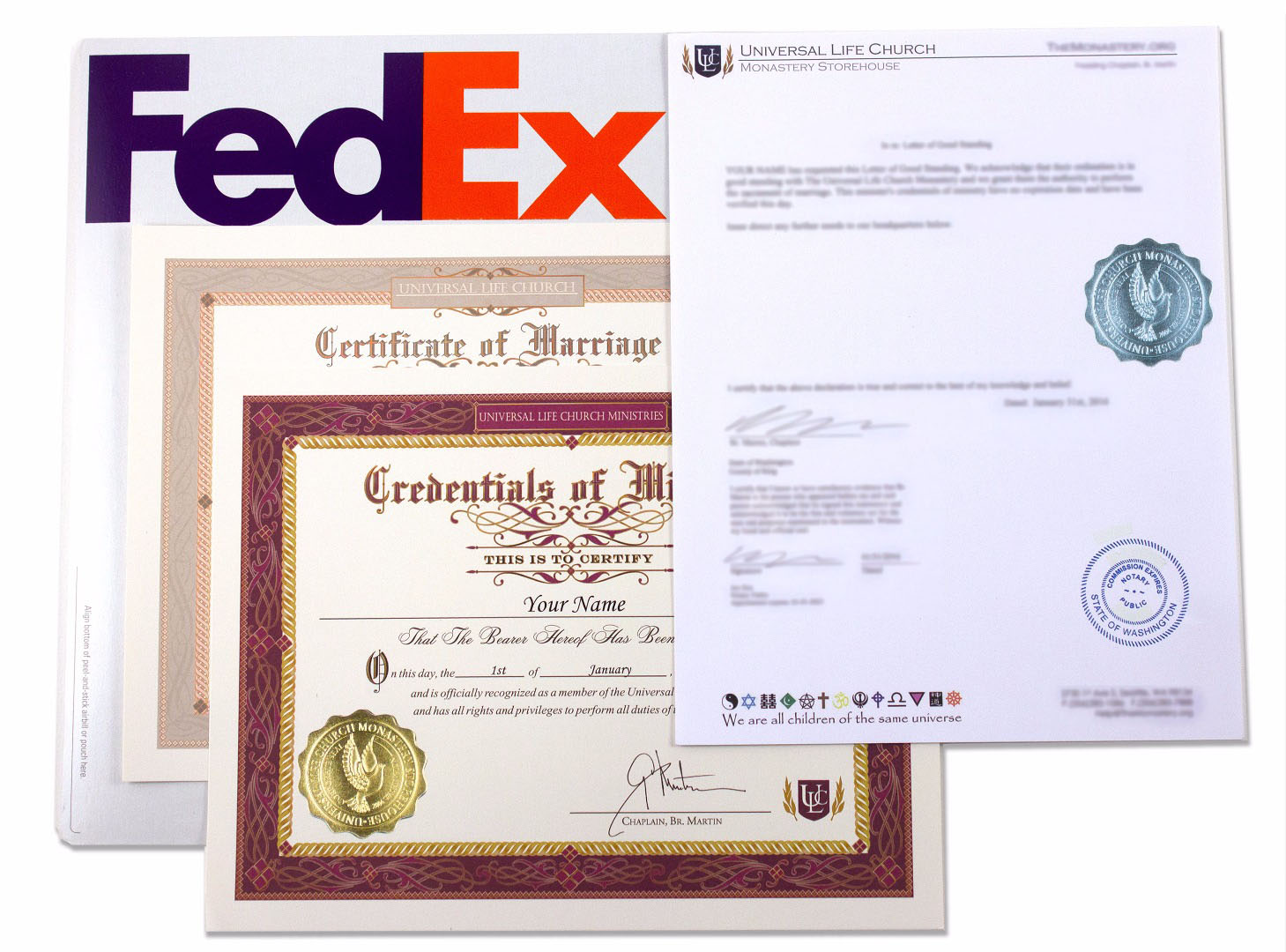 The Emergency Wedding Kit includes the essential legal documents ministers need to perform a wedding, plus rush shipping to help them arrive quickly.